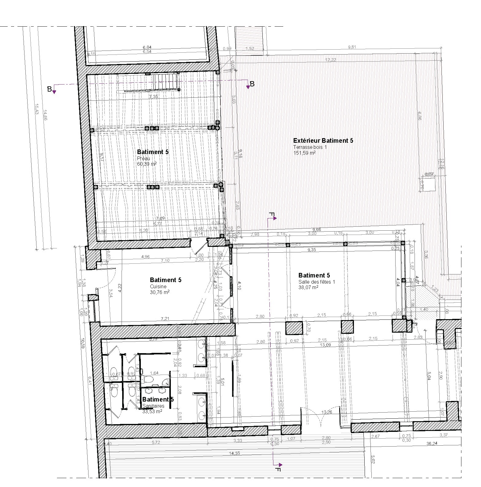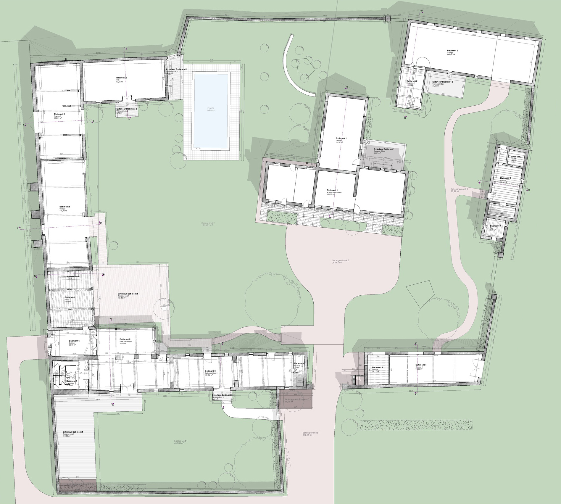 Dans le cadre d’une étude du domaine, un relevé complet de l’ensemble des bâtiments a été réalisé, comprenant plusieurs granges et une demeure bourgeoise située au centre du site. Bien que certains bâtiments aient déjà été rénovés, aucun plan global n’existait auparavant pour documenter précisément l’ensemble des bâtisses.